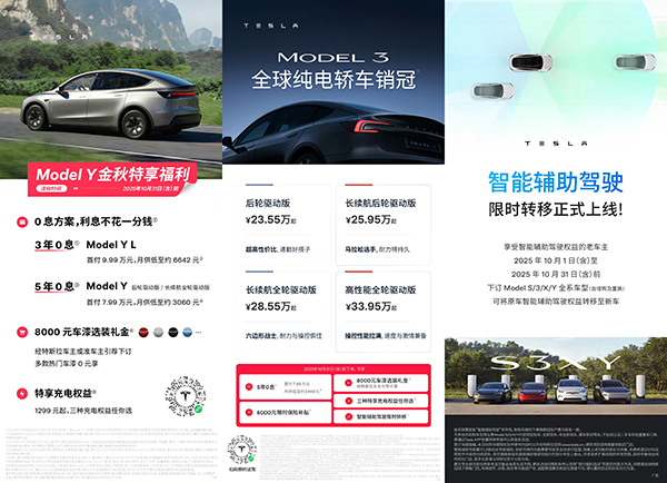 在产品持续进阶的同时,特斯拉也于10月1日推出了全新购车政策:在10月31日前下单Model Y和Model 3,可享“5年0息”(Model Y L可享“3年0息”)、8000元车漆选装礼金、1299元特享充电权益,以及“智能辅助驾驶限时免费转移”等多重金秋福利;Model 3指定版本车型还可以叠加享受8000元限时保险补贴。